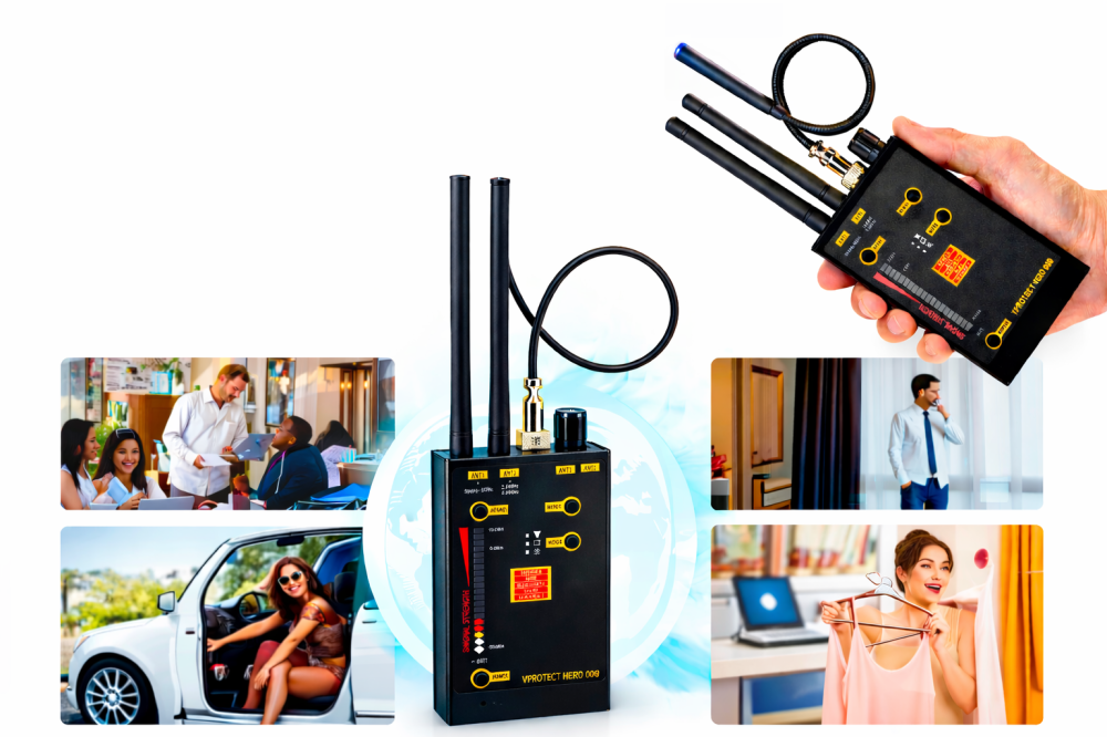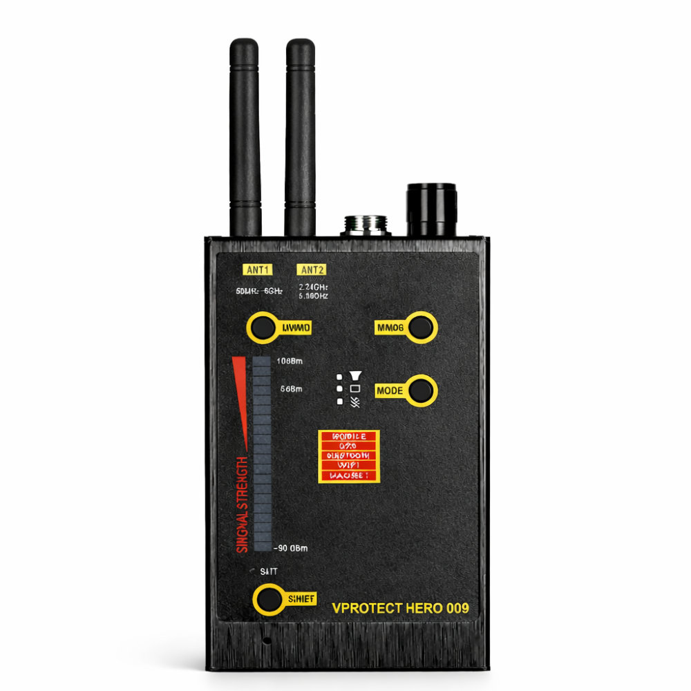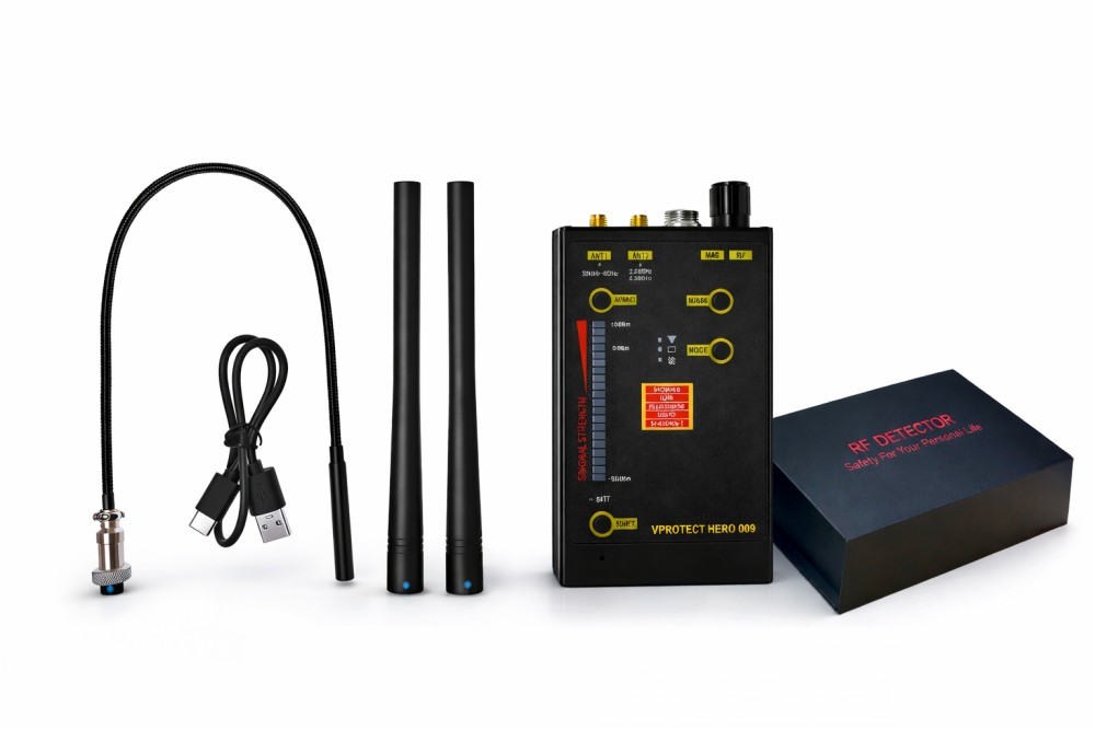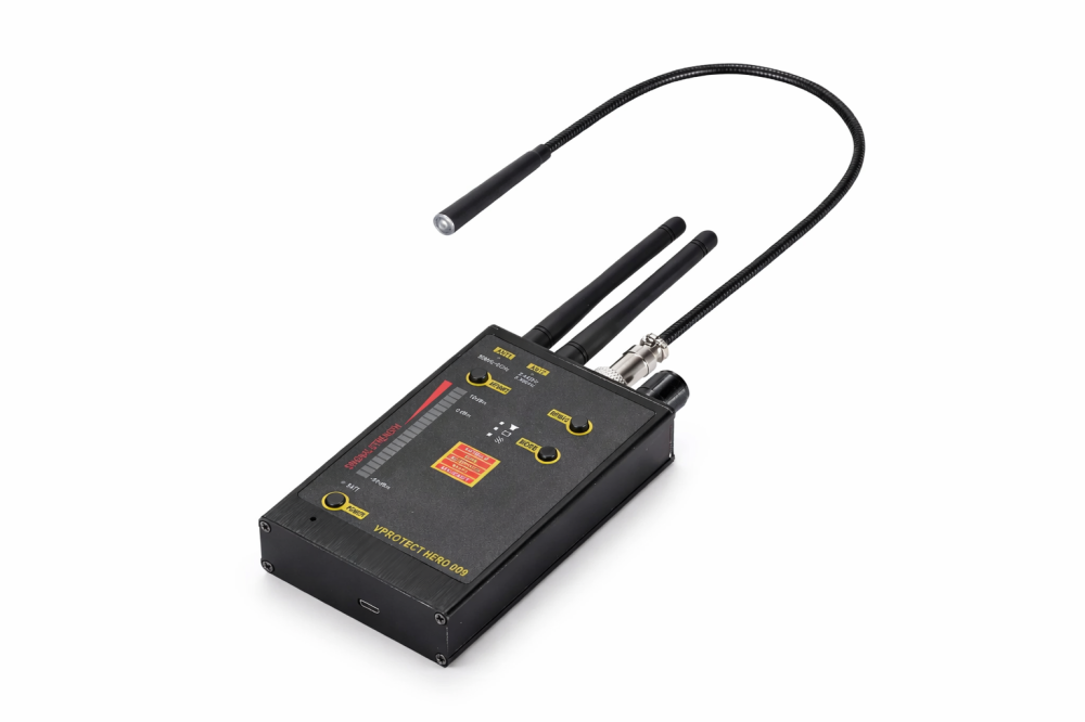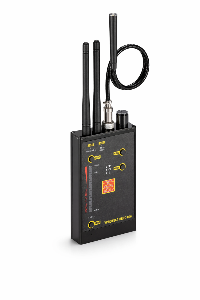 Multifunkční RF detektor skrytých kamer a GSM odposlechů VPro Hero 009 je novou generací detektorů, který na rozdíl od ostatních detektorů dokáže odhalit moderní "skryté" GSM odposlechy, které používají takové protokoly jako Bluetooth a Wi-Fi na velkou vzdálenost. Takové štěnice, zejména typy Bluetooth, jsou běžnými RF detektory prakticky nedetekovatelné kvůli jejich velmi nízkému vysílanému výkonu a speciálnímu typu modulace. Tento detektor používá samostatný kanál s vysokofrekvenčním předvoličem (2,44/5,39 GНz) k detekci a lokalizaci Bluetooth a Wi-Fi s mnohem vyšší citlivostí. Jednotka také zpracuje demodulovaný signál, aby identifikovala, který protokol byl zjištěn. Jednotka navíc dokáže odhalit všechny „klasické“ GSM odposlechy a zkontrolovat je na přítomnost korelace odesíláním zvukových impulsů, jakož i jiných digitálních přenosů na standardní vzdálenost (GSM, 3G, 4G atd.) Toto zařízení je zcela nový, revolučně změněný nástroj pro detekování nechtěných signálů.