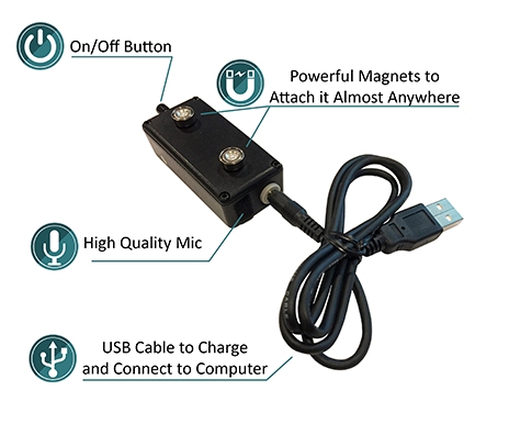 75 dní pohotovostní režim Zvukové nahrávání aktivované hlasem až do 8 metrů Magnety pro snadné umístění na sedadlech automobilů nebo téměř na jakémkoliv místě 8 GB interní paměť (288 hodin nepřetržitého záznamu) USB pro snadné použití s Windows nebo Mac - 2,5 mm jack na USB pro nabíjení nebo přenos dat |