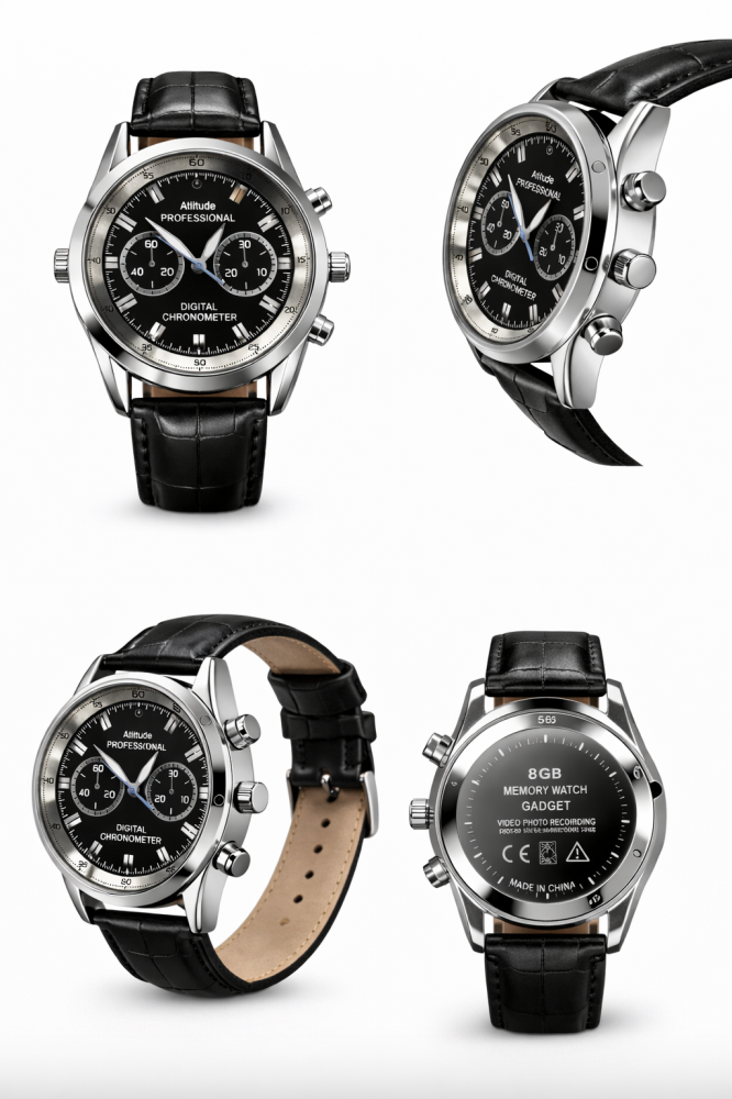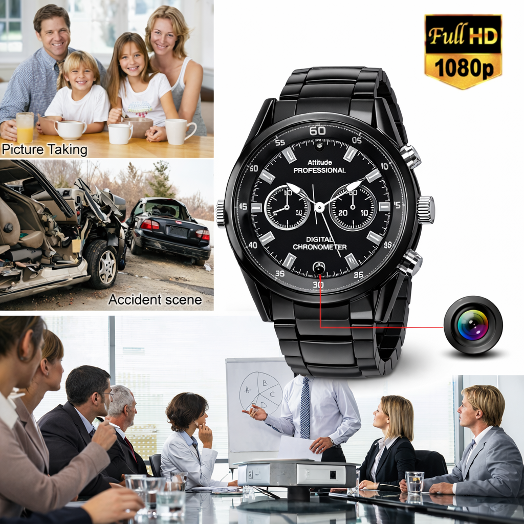 Špionážní hodinky s Full HD kamerou s nočním viděním jsou skvělou volbou při výběru špionážních hodinek pro pány. Hodinky mají kovový náramek, vypadají jako klasické hodinky, nikdo si ani jen nevšimne, že se jedná o skrytou kameru. Hodinky vytvářejí video se zvukem ve Full HD kvalitě, také fotografie a samostatné audio nahrávky. Kromě klasických hodin pro zobrazování času je v nich zabudovaná kamera s vysokým rozlišením 1920 x 1080P, mikrofon a paměť s kapacitou, do které se automaticky ukládá audio / video záznam. Špionážní hodinky mají jednoduché ovládání, elegantní design, malé rozměry a jsou snadno přenosné. Hodinky mají využití v oblasti obchodu, vzdělávání, bezpečnosti, médií, soudnictví, cestovního ruchu, zdravotnictví a životních a jiných oblasti. Hodinky splní nároky i toho nejnáročnějšího uživatele.Tyto hodinky s IR kamerou mají v sobě zabudovaný speciální čip, který umožňuje nahrávání v téměř úplné tmě.
