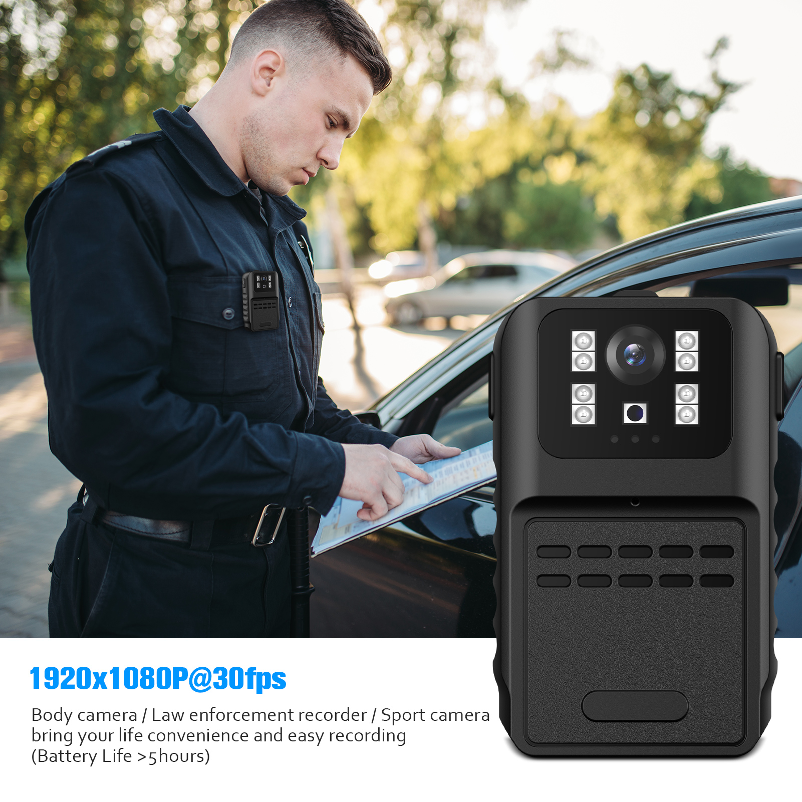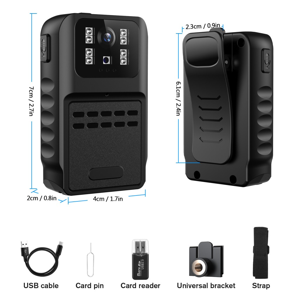 Víceúčelová tělová kamera Bodycam 880 je skvělou alternativou k profesionálním bezpečnostním a policejním kamerám. Je kompaktní a lehká a nejlépe se hodí pro civilisty, kteří nemají vysoké požadavky na specifikace a hledají něco, co by mohli snadno přenášet při samostatných procházkách nebo pochůzkách. Kamera nahrává v rozlišení Full HD 1080p. To znamená, že kvalita obrazu umožní rozpoznat podezřelé osoby. Kamera podporuje záznam na paměťovou kartu o velikosti až 128 GB. Kamera se dodává se dvěma možnostmi upevnění, a to s klipem, který umožňuje použití kamery na oděvu, nebo s ¼“ šroubovacím klipem, který umožňuje montáž na jízdní kolo. Kamera má vestavěnou baterii s kapacitou 1050 mAh, která umožňuje nahrávání po dobu 3-5 hodin.